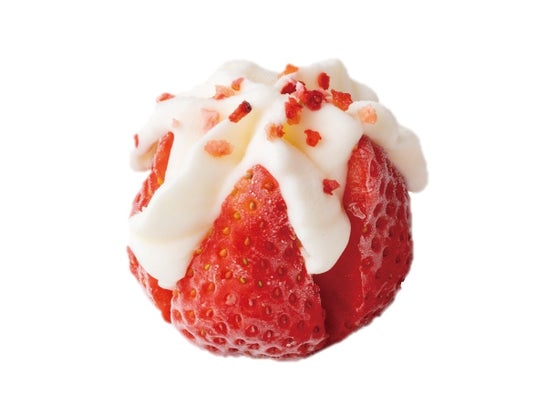 お花のように咲いたあまおう苺にホワイトチョコレートアイスを絞った華やかなアイスデザートです。フリーズドライの苺をトッピングし、やさしい甘さのホワイトチョコレートアイスと苺の酸味が絶妙な、見た目も味わいも楽しめるひと口アイスです