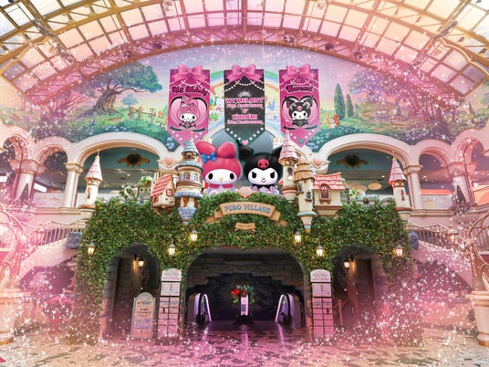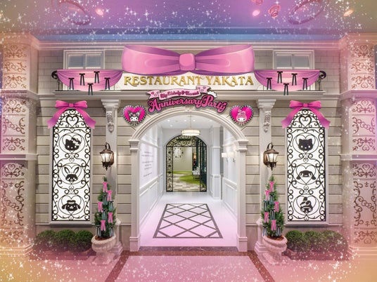好評開催中のマイメロディ50周年&クロミ20周年アニバーサリーイベント。エントランスや館のレストランの装飾がマイメロディ&クロミ一色に