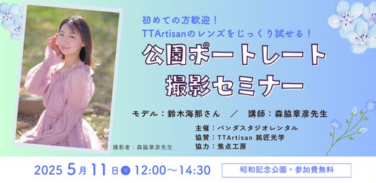 森脇章彦先生によるポートレート撮影セミナー(5/11開催)が、このたび無料イベントとなりました!開催場所は、昭和記念公園。美しい花々を背景に、モデルのポートレート撮影を楽しみませんか?そして、TTArtisanの協賛により、最近力を入れているオートフォーカスレンズを中心に、様々な明るい単焦点レンズを多数無料にてお試しいただけます。普段なかなか試す機会がないレンズも揃いますので、ぜひこの機会に新たな写りを体験してみてください。ご参加の皆さまにはできるだけTTArtisan製レンズをお使いいただけると嬉しいです!