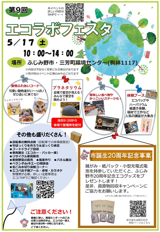 ●移動式プラネタリウム●動物ふれあいコーナー●紙すき体験●エコバック・ハーバリウム・竹ぽっくり作り●新鮮野菜の直売●自転車の無料点検●リサイクル家具販売●手形アート●資源物回収コーナー●フードドライブ●キッチンカー他詳しくは市ホームページからご確認ください