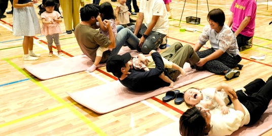 ・親子de腹筋子どもたちはママ・パパと触れ合うのが大好き。親子で楽しみながら、ママ・パパは育児で鍛えられた腹筋に挑戦!制限時間内に何回できるか!?