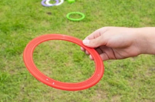 ・片手抱っこdeペグ輪投げキャンプの時の必須アイテム「ペグ」に向かって、輪投げに挑戦!子どもを片手で抱っこした状態で、ママ・パパは何個輪投げをいれられるか?!