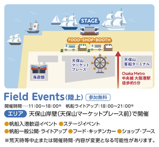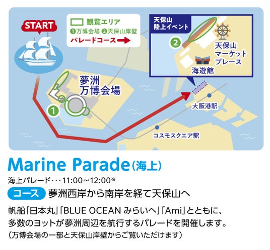 この「OSAKA SAILING EXPO 2025」のメインイベントは、海上パレード。日本を代表する帆船の「日本丸」「BLUE OCEANみらいへ」「Ami」を迎え、近隣主要ヨットクラブの協力のもと多数のヨットが参加し、夢洲西岸から南岸を経て天保山へ向かうパレードを行います。1日限りの壮大なセーリングイベントです。また陸上では、帆船入港歓迎イベント、ステージイベント、帆船一般公開、キッチンカーや各種ブースを出展予定です。