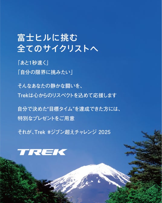 国内最大級のヒルクライムレース「第21回 Mt.富士ヒルクライム」に合わせて、Trekは大会公式スポンサーとして5月1日より、参加型キャンペーン「#ジブン超えチャレンジ」を開始いたします。このチャレンジは、参加者自身が設定した“目標タイム”を超える走りを達成した方へ、Trekから特別なギフトを贈るものです。順位や記録ではなく、「昨日の自分を超える」ことに価値を見出すすべてのライダーを称え、応援する取り組みです。