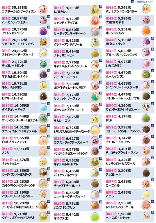 これまでサーティワンが発売してきた、1,400種類以上のフレーバーの中から厳選した計60種の人気フレーバーがエントリーし、栄えある1位に輝いたフレーバーはさらに開発を加えてパワーアップさせて、新作フレーバーとして発売予定。さらに、「昔大好きだったあの期間限定フレーバーをもう一度食べたい!」というお声にお答えし、期間限定フレーバーの中から上位4位を勝ち取ったフレーバーは2026年1月から3ヶ月ごとの復刻販売を予定しています!それでは、気になる結果を見ていきましょう♪