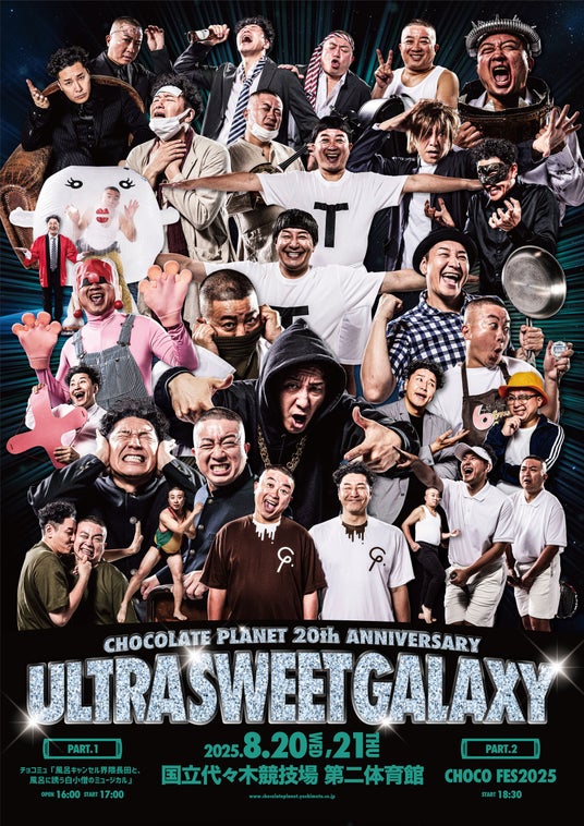 先月の第1弾開催概要発表により大きな話題を呼んだ、チョコレートプラネット結成20周年を記念したライブ “CHOCOLATE PLANET 20th ANNIVERSARY「ULTRA SWEET GALAXY」に関して、このたび、新たなメインビジュアルの解禁とともに、豪華追加出演者が発表されました。