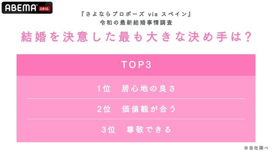 放送開始に先立ち、番組では20代から50代の男女を対象に、結婚に関するアンケート調査を実施。結婚の決め手や不安、「事実婚」「婚前契約」など新たな結婚の形への印象などリアルな意見が明らかになりました。