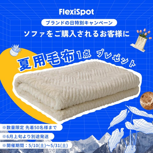 5月10日(土)10:00 - 5月31日(土)23:59の期間中に、ソファをご注文いただいたお客様に、先着50名様限定で夏用毛布を1点プレゼントします。