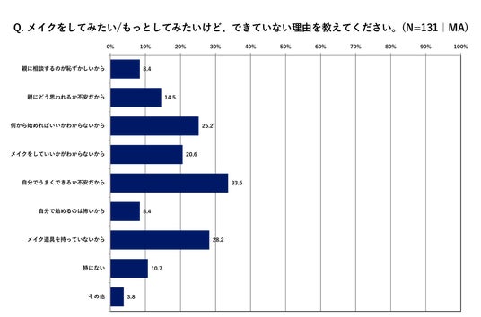 メイクをしたことがない/日常的にしていない方に向けた「メイクをしてみたい/もっとしてみたいけど、できていない理由を教えてください。」という質問には、「自分でうまくできるか不安」が33.6%、「道具を持っていない」が28.2%、「何から始めればいいかわからない」が25.2%といった声が多く、「親にどう思われるか不安」14.5%、「親に相談するのが恥ずかしい」8.4%など、保護者からの目線が一歩踏み出せない理由になっていることも浮き彫りになりました。さらに、メイクに関する悩みについての質問では、「誰かに教えてほしい」が22.1%、「親と一緒にやってみたい」が16.1%と“最初の一歩”をサポートしてくれる存在や環境が求められていることが分かりました。