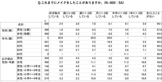 ・小学生低学年(1~3年生)の男の子では、2割がメイク経験ありと意外な結果に