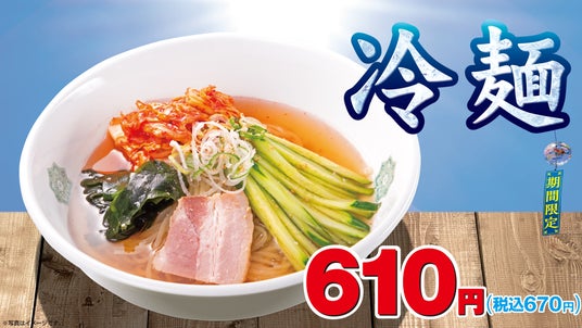 夏の暑さにぴったりな冷麺を今年も期間限定で販売いたします。「冷麺」は、ビーフと昆布だしを絶妙にブレンドし、旨みを引き出したフルーティーで酸味のあるコク深いスープに専用粉を真空ミキサーで混ぜ合わせることにより、つるつるでコシのある麺を使用。トッピングは、白菜キムチ、チャーシュー、わかめ、きゅうり、薬味ネギを使用し、暑さの厳しい日に涼しさを感じていただける一杯に仕上げました。