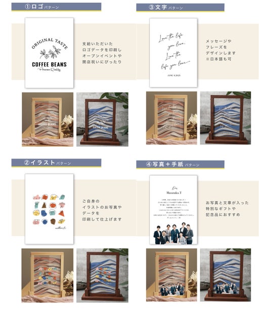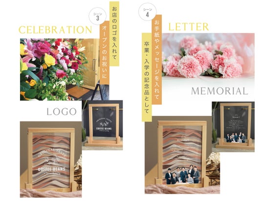 今までは結婚式用のサンドセレモニーに文字の刻印のみでしたが、写真やロゴマークが追加できるようになったことで、様々なイベントに使用できるようになりました。カップルの記念品、家族の記念碑、お店のオープン記念、卒業式送別会、などなど。