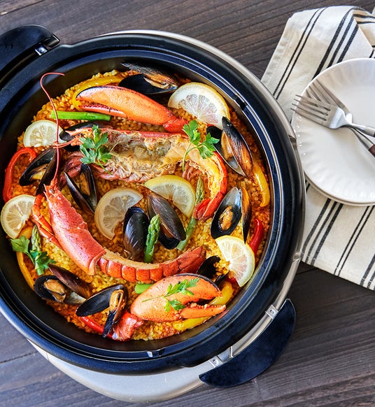 ロブスターを使用したパエリアのレシピをご紹介しています。