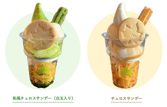以前大好評をいただいた「チュロスサンデー」の他に、2種類の宇治抹茶ソースに白玉をトッピングした「和風チュロスサンデー」が新登場!