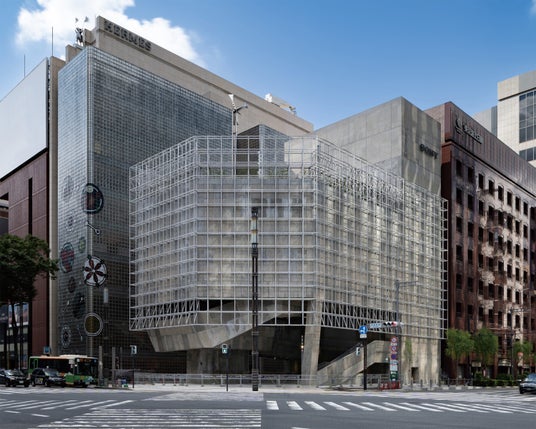 地下4階・地上5階建ての特徴的な建築は、あえて銀座の標準的なビルの半分ほどの高さに抑え、街に空間的な余白とリズムをもたらしています。地上は三方が通りに開かれ、地下鉄や地下駐車場とも直結。さらに、地下1階から地上2階へと広がる大きな吹き抜け構造や縦のプロムナードが、街とのシームレスな繋がりをより都会的で立体的なものにしています。