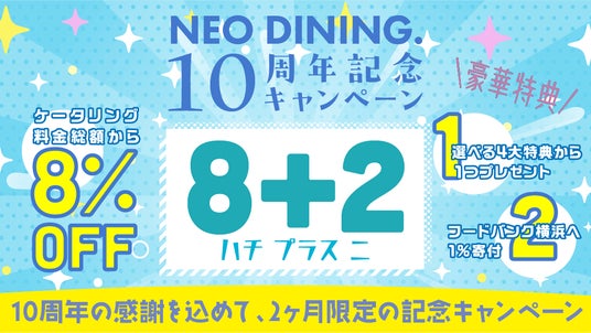 株式会社NEO FLAG.(本社:神奈川県横浜市、代表取締役:新野仁也/以下、当社)は、ケータリングサービス「NEO DINING.」のOPEN10周年を記念し、5月9日(金)より「8+2 お客様感謝キャンペーン」を開催することをお知らせいたします。