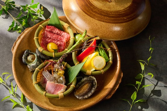 湯の愉しみと温もりにあふれる宿、ラフォーレ伊東温泉 湯の庭で、伊豆牛や金目鯛、鮑、イセエビなどの山海の恵みを、伊豆下田の温泉水で一気に蒸し上げた宝楽焼をお楽しみいただく宿泊プランです。蓋を開けたときの立ちのぼる湯気、蒸し上げられた食材の豪華な見た目が食欲をそそり、5種のつけダレで飽きることなくお召し上がりいただけます。料理に合わせた地酒とともに、贅沢なひとときをお楽しみください。