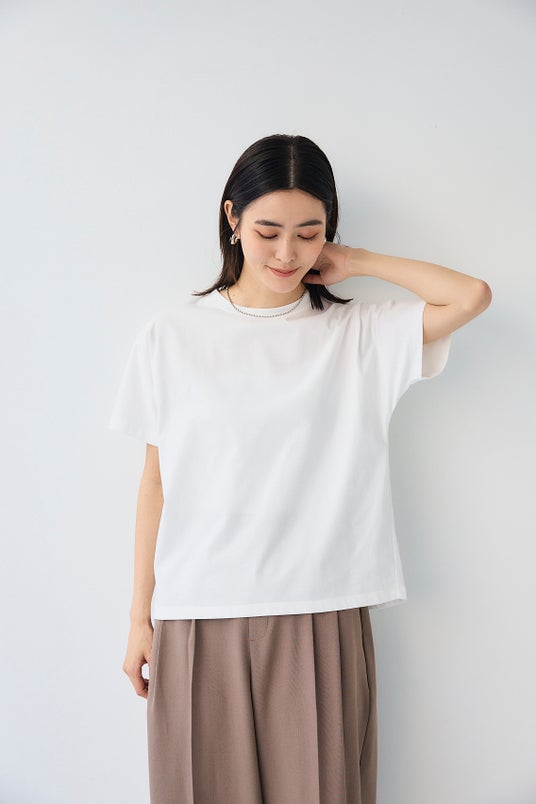 すべてに共通するのは体のラインを拾いにくい素材やシルエットに尽きると思います。そこにプラスして気になる二の腕を隠してくれるのがドルマンシルエット、イカリ肩や胸骨が張っている方は、ハリ感もありつつ柔らかい素材など体型に合ったTシャツを選ぶ事が大事なポイント。