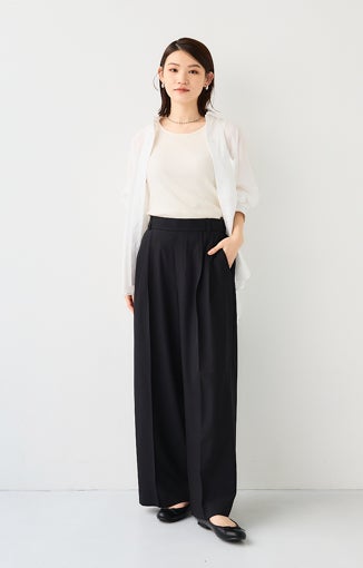 ウエストベルトラインがスッキリしているものや、腰、太ももから足先のラインをなだらかに見せてくれるアイテムをセレクトするのがベスト。また、タック入りやハリ感があるものを選ぶと体のラインを拾いにくく、奥行き感も出て細見え効果も!