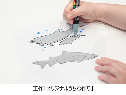 「生きものスマシースクール」は、子どもたちに大人気のイルカやサメについて詳しく学べる小学生を対象とした教育プログラムです。イルカトレーナーの解説を聞きながら今年の2月に誕生したバンドウイルカの赤ちゃんを近くで観察できるほか、遊泳するサメや水槽の底でじっとしているサメの特徴を観察して、それぞれの違いを標本や解説を通じて学ぶことができます。さらに、プログラムの終わりには透明なうちわに生きものの絵を描く工作を実施し、プログラムで学んだことをお土産としてお持ち帰りいただけます。