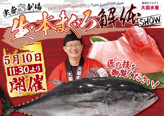 2025年5月17日(土)の11時半から和歌山の串本から直送された新ブランド「大島マグロ」の解体ショーを大起水産 まぐろパークEXPO店で実施します。捌きたてのマグロはその場で本鮪丼やにぎり6貫にして数量限定で販売します。