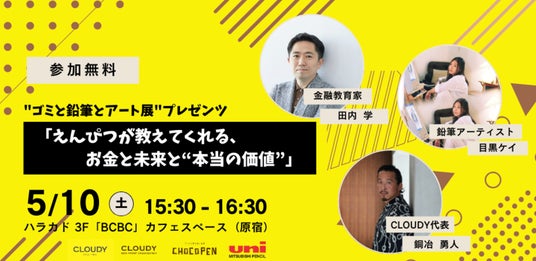 CLOUDYと三菱鉛筆で開催の「ゴミと鉛筆とアート展」。5月10日、目黒ケイさん、田内学さん、CLOUDY 銅冶によるトークイベント「えんぴつが教えてくれる、お金と未来と“本当の価値”」を開催します。