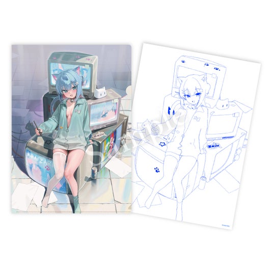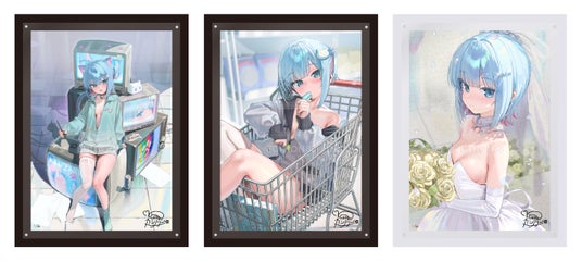 独特の輝きを持たせたファインペーパーと、高発色で鮮やかな色彩が美しい透明なフィルムを作品によって使い分け、イラストの風合いや世界観を引き立てています。