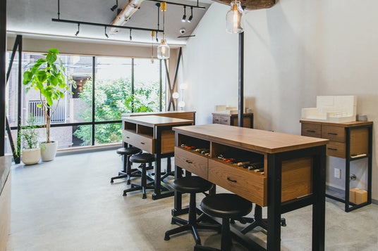 無垢材のテーブル、丁寧に育てられたグリーン、手作りの道具が静かに並ぶ工房は、ふたりだけの指輪作りにぴったりな、落ち着いた空間です。