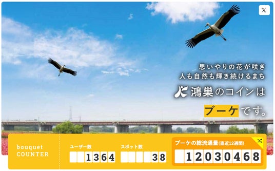 鴻巣市の通貨名は「ブーケ」です。「ブーケ」のアイコンは、市のSDGs推進のシンボルであるコウノトリが、市のSDGsに貢献してくれた方へ感謝のブーケ(贈り物)を渡している姿をイメージしました。