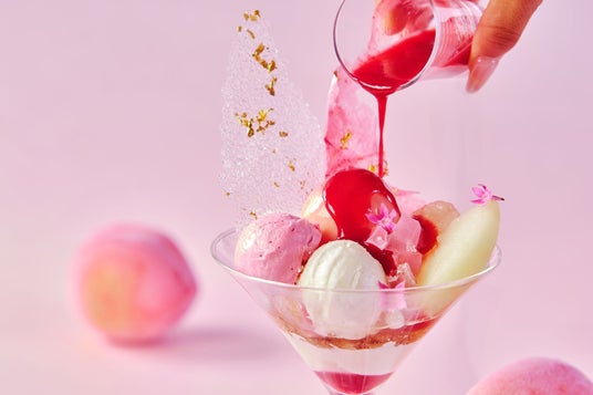グラス上部には、ごろっとした桃の果実をはじめ、甘酸っぱくさわやかな赤桃ソルベと白桃ソルベの上品でやわらかい自然な甘さがバランスよく混ざり合い、口の中でひんやりとろけます。真ん中のレモングラス香る桃のソースとバニラムースは、“ぷるん”とした見た目が可愛らしい桃に見立てたムースです。