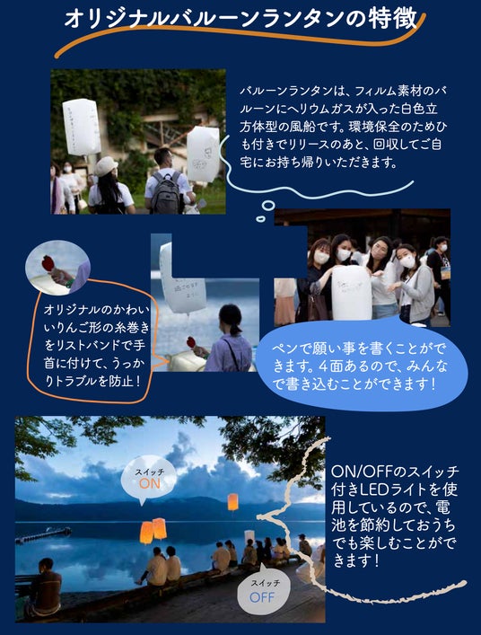 ・開催中止の場合は、バルーンランタンの払い戻しはお受けできかねます。予めご了承ください。中止当日のバルーンランタンをご予約された方は翌日以降の開催・順延日にイベントをご参加いただけます。ご参加に不都合がある方は最終開催日から5日以内に、十和田湖観光交流センター「ぷらっと」にてバルーンランタンをお受け取りいただけます。