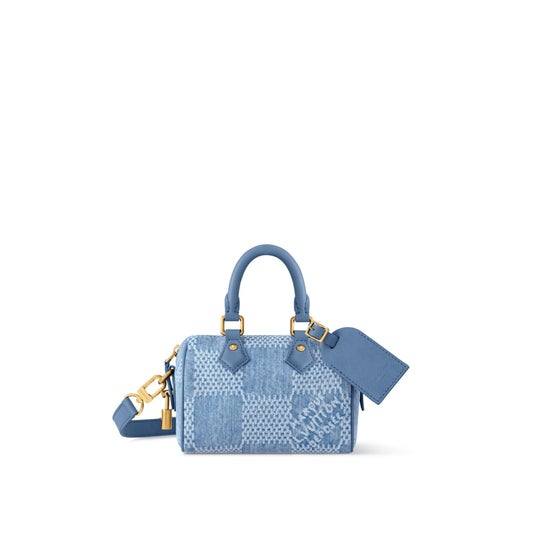 「スピーディ・バンドリエール 30」。カジュアルに再解釈されたメゾンのアイコニックなダミエのチェック・パターンが、シティバッグにタイムレスで都会的な印象を添えます。色味を合わせたブルーのレザートップハンドルと取外し & 調節可能なショルダーストラップでさまざま持ち方を楽しめる一品。