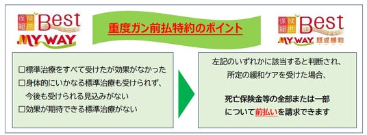 そこで、重度のガン患者の経済的な不安の解消を目的とし、標準的ながん治療をすべて受けたが効果がなかったなどと判断され、その後所定の緩和ケアを受けた場合に死亡保険金等を前払いすることができる「重度ガン前払特約」の取扱いを開始します。