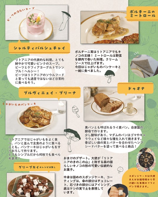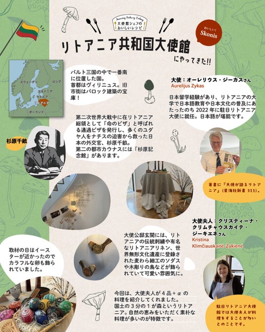 食文化を駐日リトアニア大使オーレリウス・ジーカスさんが紹介、大使夫人のクリスティーナ・クリムチャウスカイテ・ジーキエネさんが心を込めてレシピをレクチャー。リトアニアの家庭の味を、本格的に、でも気軽に楽しめる内容をお届けします。