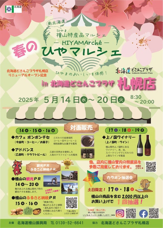 北海道檜山振興局では、管内の地域産品の認知度向上及び販路拡大を図るため、道の公式アンテナショップ「北海道どさんこプラザ札幌店」において、檜山特産品フェア「ひやマルシェin北海道どさんこプラザ札幌店」を開催します。