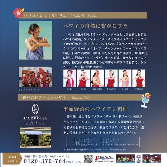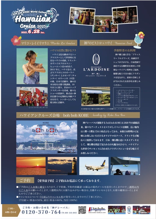 今回、6月28日にはその第2段として、フラダンスショーにboh boh KOBEでのクルージングと美しいサンセットを合わせさらにスケールアップした非日常なハワイアンショータイムをお届けいたします。お電話にてご予約受付中!