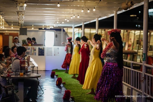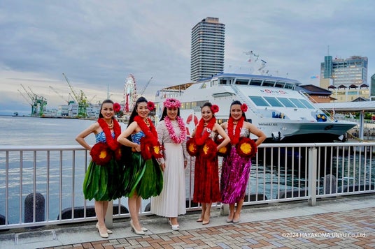 神戸シーバスでは2024年より世界を舞台に活躍する一流アーティストをboh boh KOBE船上へと誘致し、各国の伝統的な音楽や、舞踊・ダンスによる演出を加えて、生パフォーマンスを目の前で体感いただけるよう、様々なアーティストとのコラボレーションイベントを進めてまいりました。その皮切りとして昨年10月4日(金)に、【‟boh boh KOBE 4th Anniversary World Culture LIVE” Hawaiian Night】と題し、停泊した船上でフラダンスを楽しむハワイアンイベントを実施し、満員御礼での終演となりました。今回、6月28日にはその第2段として、フラダンスショーにboh boh KOBEでのクルージングと美しいサンセットを合わせさらにスケールアップした非日常なハワイアンショータイムをお届けいたします。お電話にてご予約受付中!