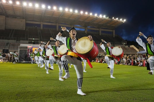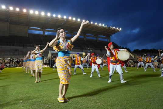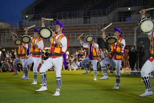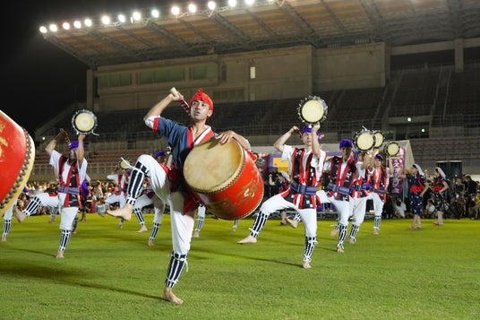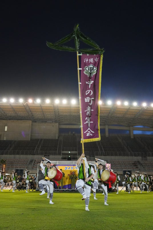 沖縄市の夏の風物詩「エイサーナイト」は、地域の青年会が週替わりで迫力ある演舞を披露する伝統行事です。