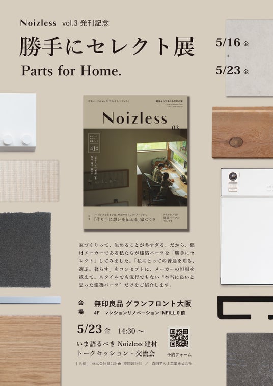 森田アルミ工業株式会社(所在地:大阪府阪南市、代表取締役:森田和信)からリリースされた建築パーツセレクトブランド「Noizless」は、株式会社良品計画と共催で展示販売イベント「勝手にセレクト展 Parts for Home.」を無印良品 グランフロント大阪にて5月16日(金)~ 5月23日(金)の期間に開催いたします。パネル展示・書籍『Noizless VOL.03』の販売、5月23日(金)にトークイベント・交流会を行います。