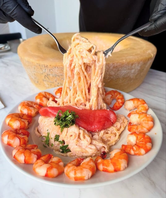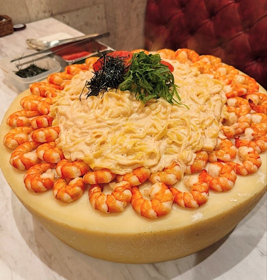 巨大チーズの上で仕上げる炎の明太子クリームパスタ
