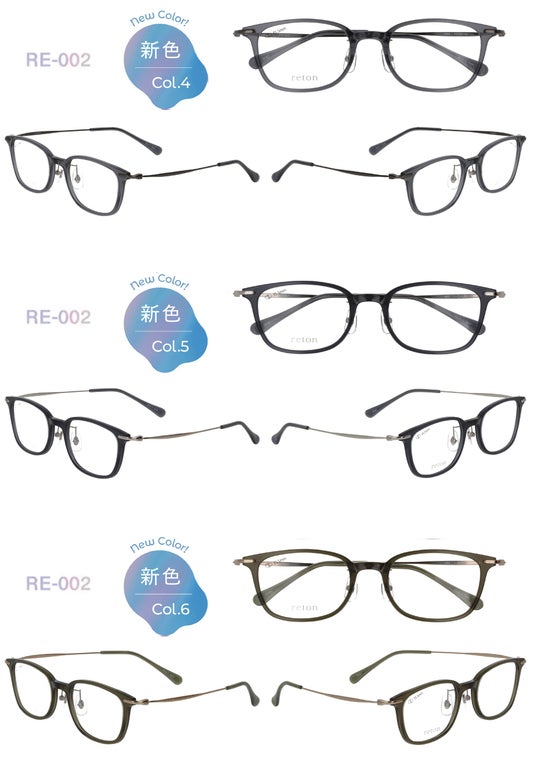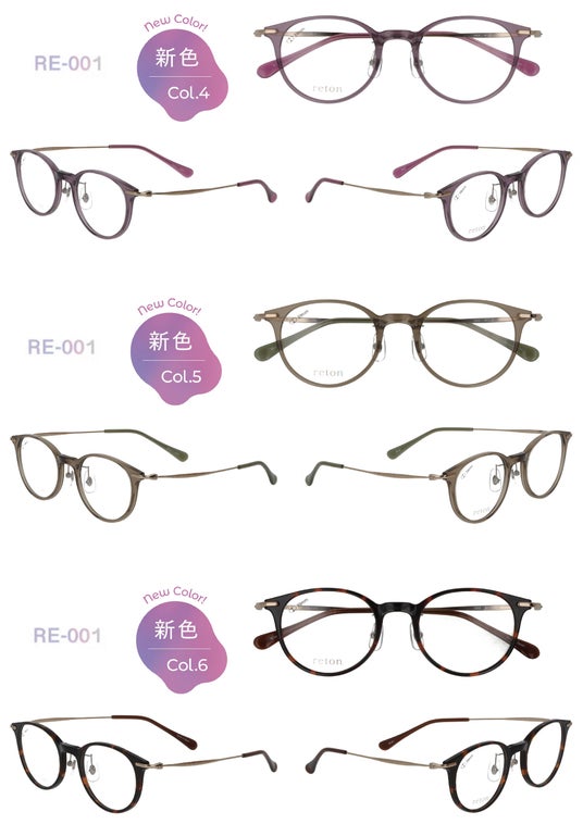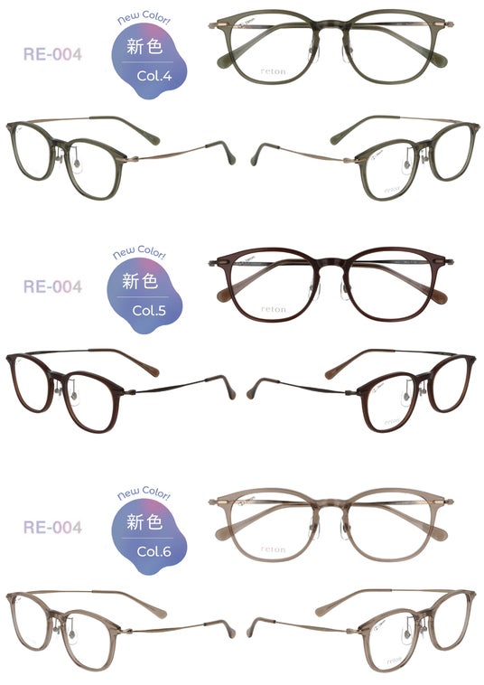 今回の新色は「reton」の特長である透明感あふれるトロガミド素材の美しさを最大限に引き出すカラーを4型、それぞれ3色ずつ展開します。12バリエーションの新たな彩りは、素材が持つ耐久性もそのままに美しい発色を長くお楽しみいただけます。・reton RE‐001 C-4、C-5、C-6