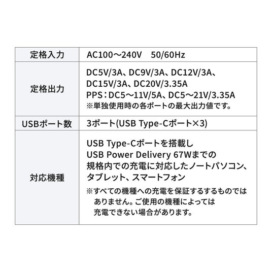 USB Power Delivery規格に対応し、1ポート使用時は最大67Wの高出力を実現。一般的なノートパソコンはもちろん、タブレットやスマートフォンもこれ1台で急速充電可能です。