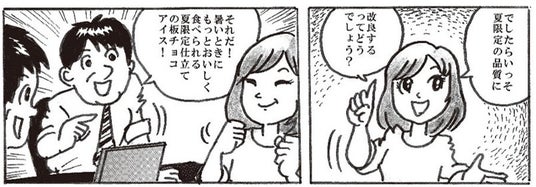 夏限定品質はお客様からご好評をいただき、今年で3年目の発売となります。「暑い夏にチョコを楽しむのにぴったりなアイス」ということをみなさんに知っていただくために、開発ストーリーを漫画にしました。夏限定の板チョコアイスをどうぞお楽しみください!(冷菓マーケティング部:谷山)