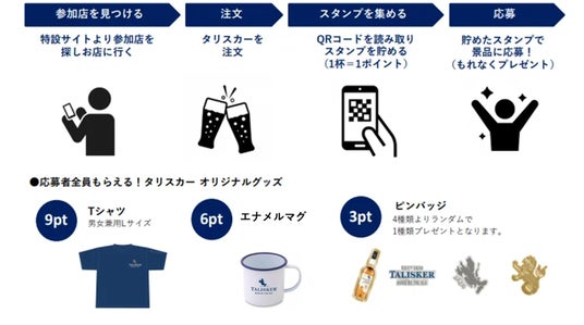 昨年ご好評いただいたこのペアリングをより多くの方に楽しんでいただくため、今年は東京・大阪・札幌・名古屋・福岡の5エリアで展開、タリスカー スパイシーハイボールと肉料理のペアリングを愉しみながらスタンプが貯められ、貯めたスタンプの数に応じてオリジナルグッズがもらえます。