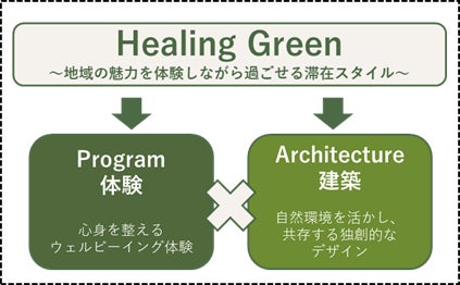 本施設は2000m級の三国山脈に囲まれ、夏でも涼しく快適に過ごせる群馬県吾妻郡草津町にて開業します。湯畑までわずか15分の距離に位置し、足湯や顔湯、立ち寄り湯を巡りながら、名湯の恵みを存分に堪能できるロケーションが魅力となっております。本施設では、慶應義塾大学医学部教授宮田裕章さんやライフスタイリスト大田由香梨さん他スペシャリスト達とともに、日本を代表する温泉地のひとつである草津の魅力を最大限に活かし、都会の喧騒を忘れ、地域の魅力を体験しながら過ごせる滞在スタイル「Healing Green」を提案します。名湯に身を委ね、美食を堪能し、四季折々の豊かな自然に包まれることで、心と身体に深い癒しを与える特別な時間をお届けします。