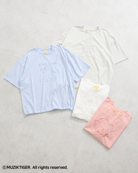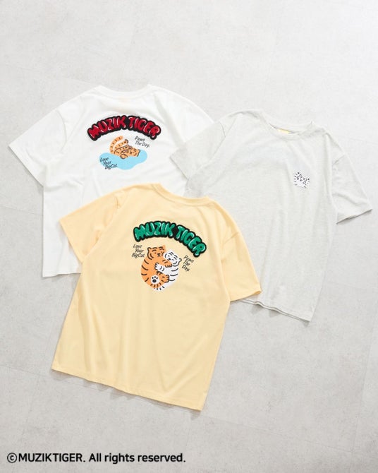 注目アイテムは、夏のお出かけが楽しくなるカラフルなTシャツです。可愛らしいトラの後ろ姿や『MUZIK TIGER』のロゴをさがら刺繍で施し、キャラクターがもつポップな世界観を表現。また、ゆるいポーズのトラとハングルを組み合わせた、それぞれ異なるデザインのTシャツも取り揃えました。