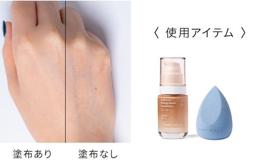 メイクアップスポンジを使って、アンビシャス ビューティーセラム ファンデーションを塗布した結果、重すぎない自然なカバー力と、みずみずしい艶膜肌を実現。ファンデーションの密着度や艶感、素肌感、透明感を全て高める、細部にまでこだわりの詰まったメイクアップスポンジとセット使いがおすすめです。