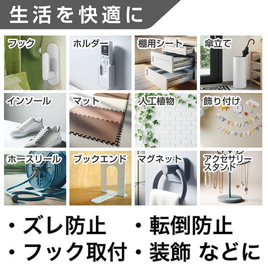 日常生活を快適にするために、フック・マット・ブックスタンドなどのズレやすい・倒れやすいものの一時固定にご使用いただけるほか、リモコンホルダーやホースリール・人工植物(ガーランド)など、固定方法が限定されてきたものへの新しい固定アイテムとして活用いただけます。