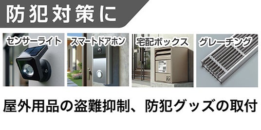 また、防犯対策として、防犯グッズの取り付けや屋外用品の固定に使用できるほか、防災対策として揺れ・風による転倒抑制など、これまでにはなかった一時固定用途にも多数対応しています。みなさんのアイデア次第で更に可能性が広がる1本です。