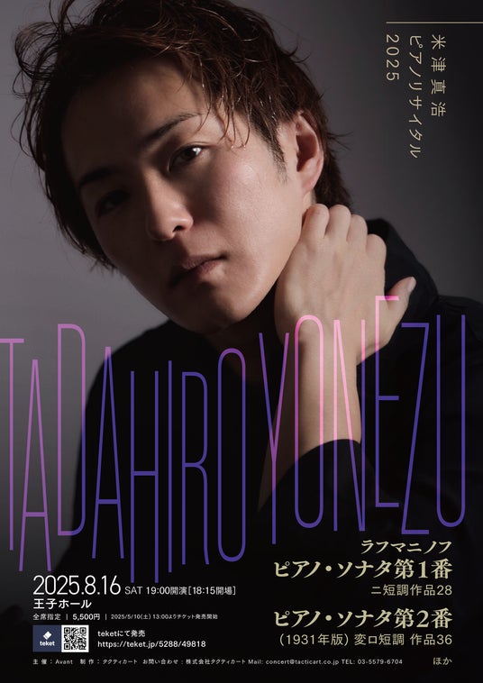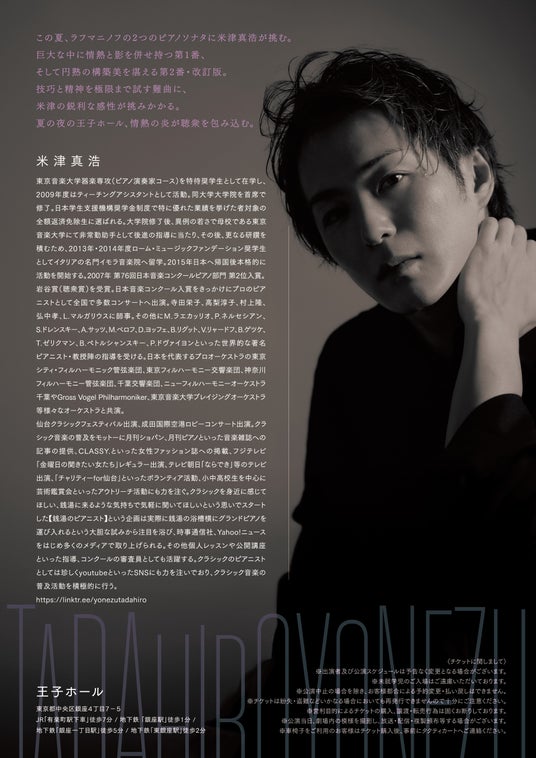 米津にとってラフマニノフといえば、ピアノ協奏曲第2番・第3番の2曲を1公演で演奏するなど、米津が得意とする作曲家の一人。技巧の先にある精神性を引き出し、作曲家の「声」を現代に届けることに真摯に向き合う米津のピアノによる今回の2大ソナタの公演は、技巧や迫力のみならず、作品が持つ詩情や内的ドラマまで掘り下げる、極めて濃密な音楽体験となることでしょう。